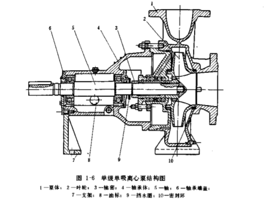 單級(jí)單吸離心泵常為臥式,它的結(jié)構(gòu)如圖1-6所示。由葉輪、泵體、泵軸和軸承、軸封等主要部分組成,現(xiàn)分述于下。